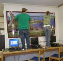 The framed portraits of Abe and George have been moved to a different wall and replaced with a color mural. The 4′ x 8′ photo mural has been installed on the wall by the computer terminals. The original photo was taken from the Munson Lakes Nutrition tower (thanks, John) and shows Howard Lake, Memorial Park and surrounding areas in the Spring.